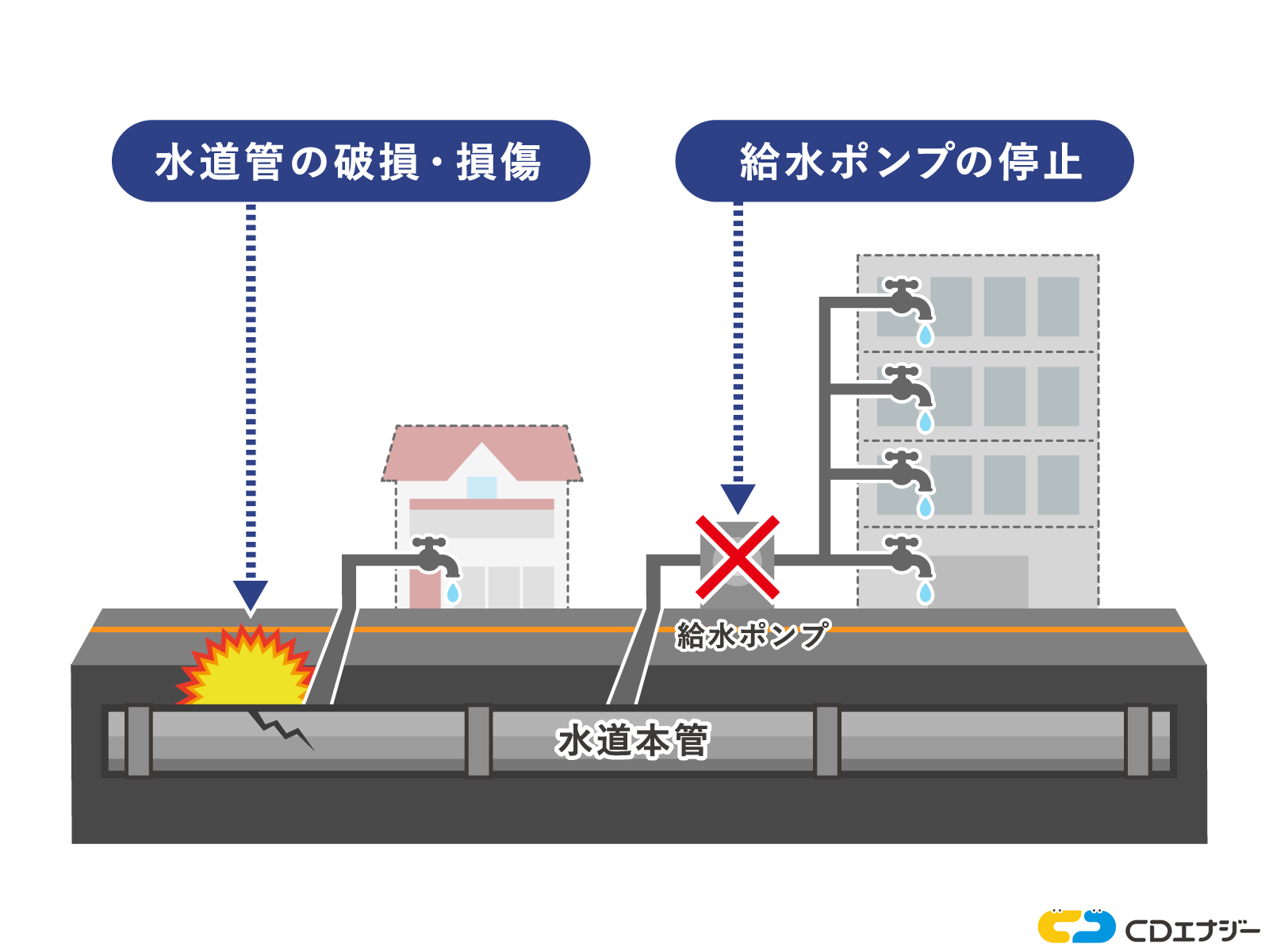 また、地震で家屋が流されるような大規模な被害の場合、水道管と住宅の接続部分が切断され、広範囲で断水することもあります。